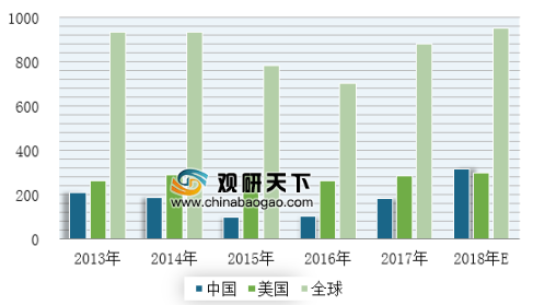 2013-2018年E全球、美國與中國工程機(jī)械市場(chǎng)規(guī)模對(duì)比(單位:億美元)